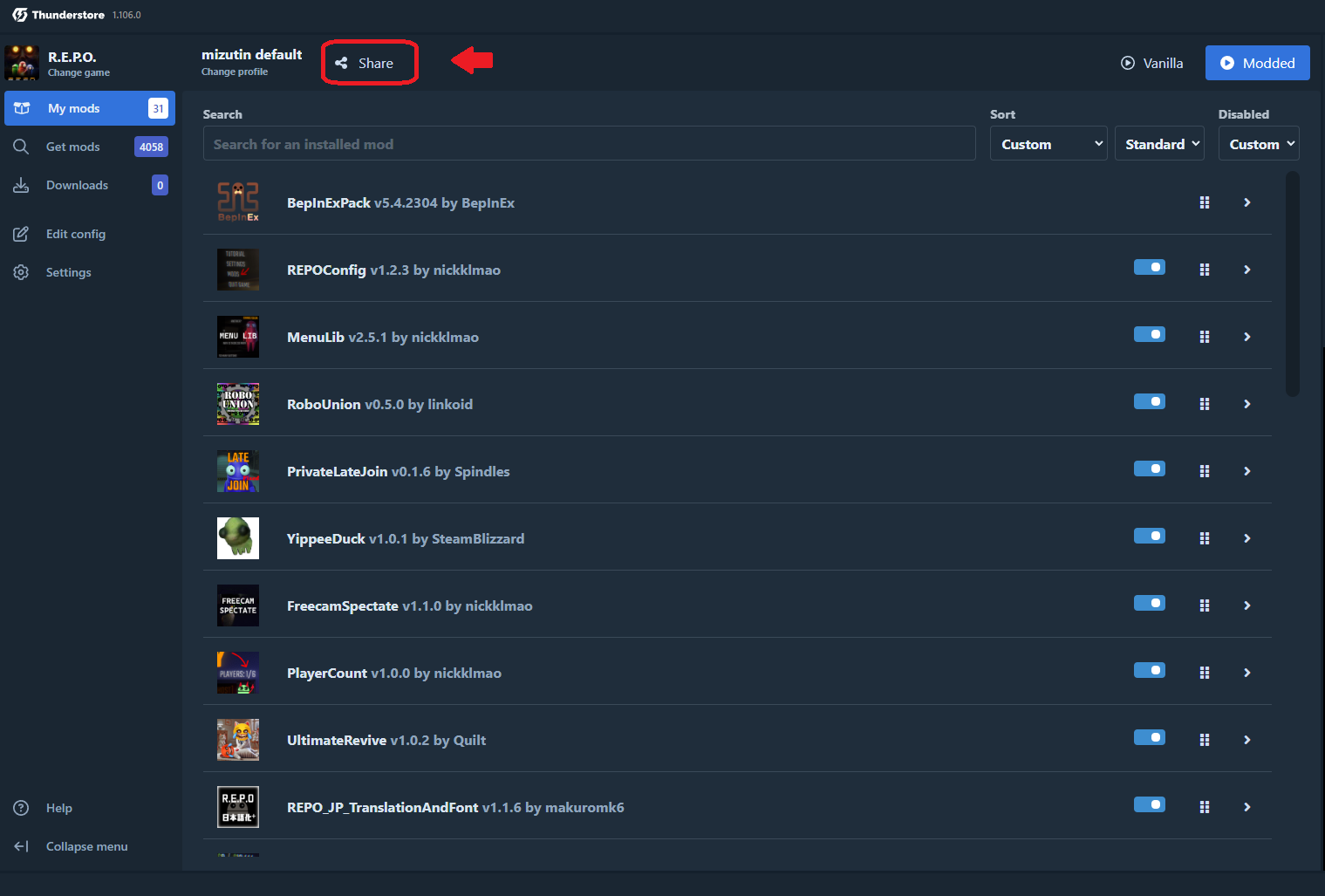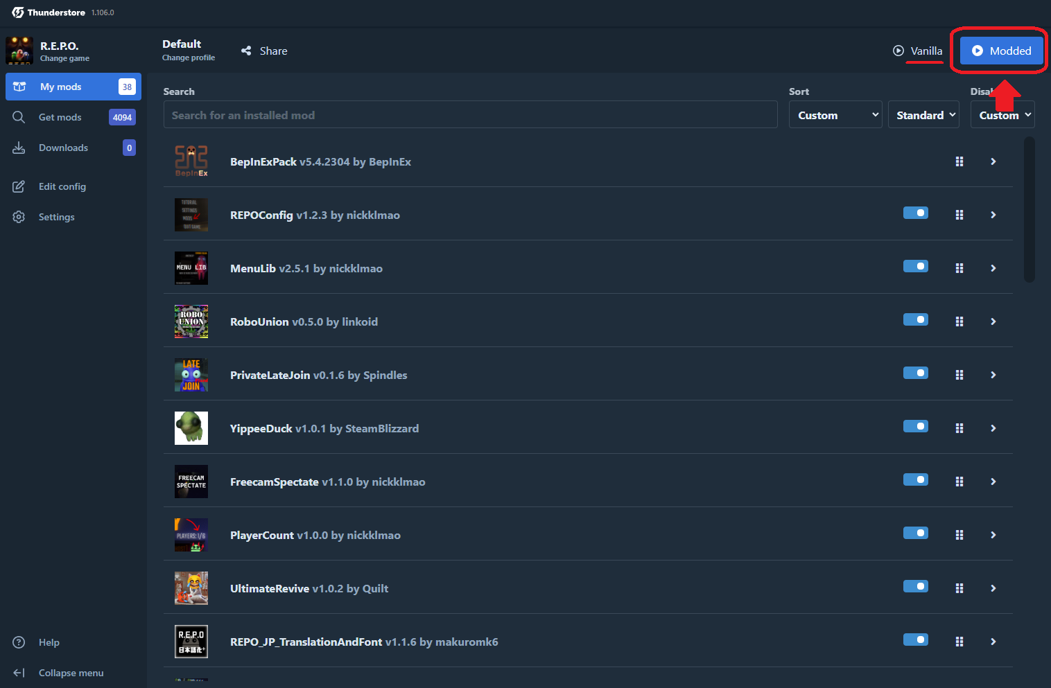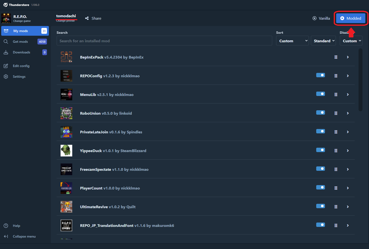 準備ができたら右上の「Modded」ボタンをクリックします。