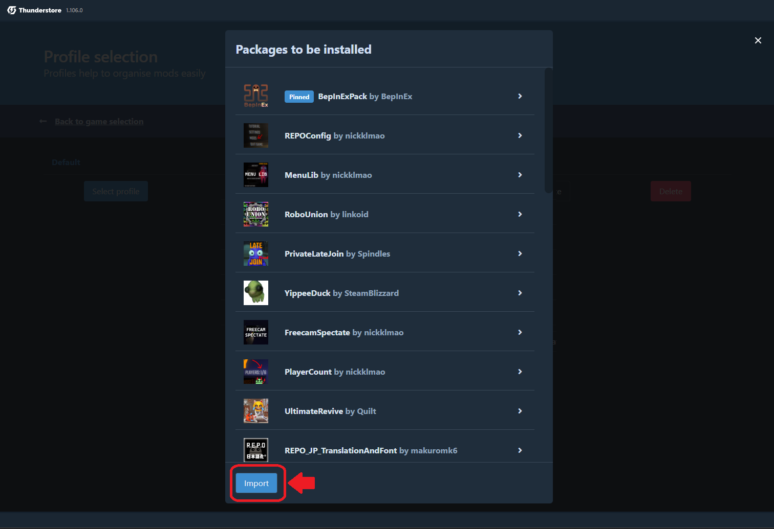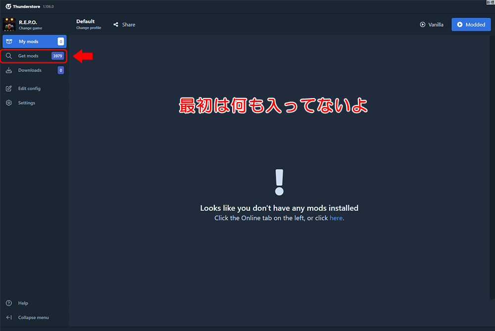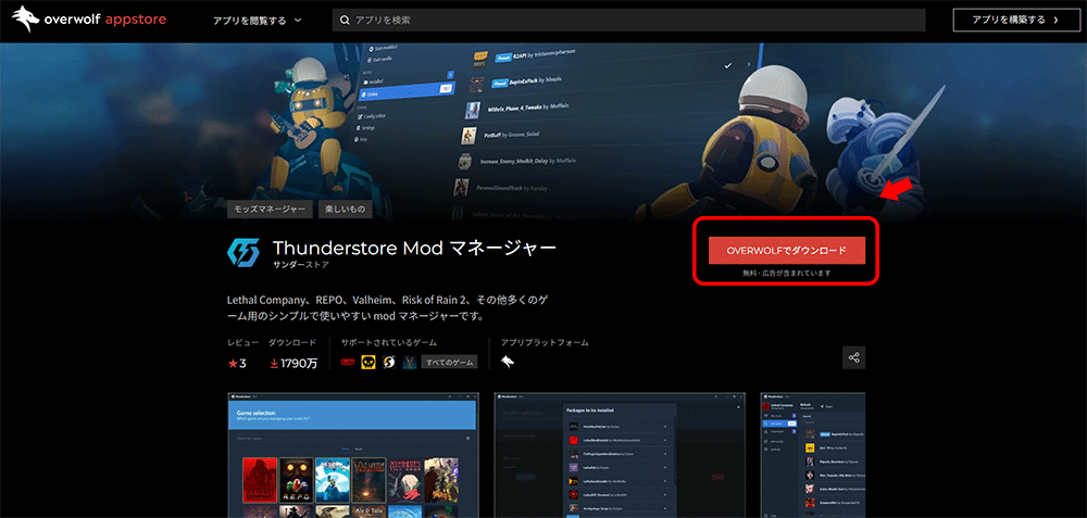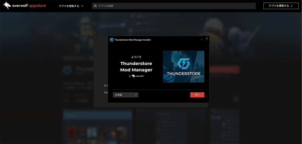 まずは「Thunderstore Mod Manager」というアプリが必要ですので、そちらをダウンロードしてください。
